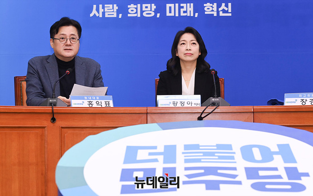 홍익표 더불어민주당 원내대표가 8일 오전 국회에서 열린 '더불어민주당 6호 인재영입식'에서 황정아 한국천문연구원 책임연구원을 소개하고 있다.