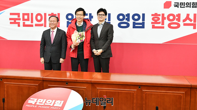 윤재옥 국민의힘 원내대표와 한동훈 비상대책위원장, 방문규 전 산업통상자원부 장관이 8일 오전 국회에서 열린 '국민의힘 인재영입위원회 입당 및 영입환영식'에서 기념촬영을 하고 있다.