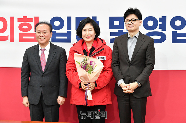 윤재옥 국민의힘 원내대표와 한동훈 비상대책위원장, 이기순 전 여성가족부 차관이 8일 오전 국회에서 열린 '국민의힘 인재영입위원회 입당 및 영입환영식'에서 기념촬영을 하고 있다.
