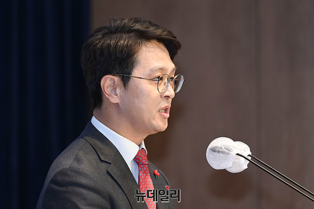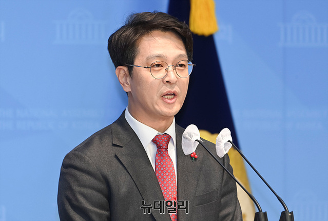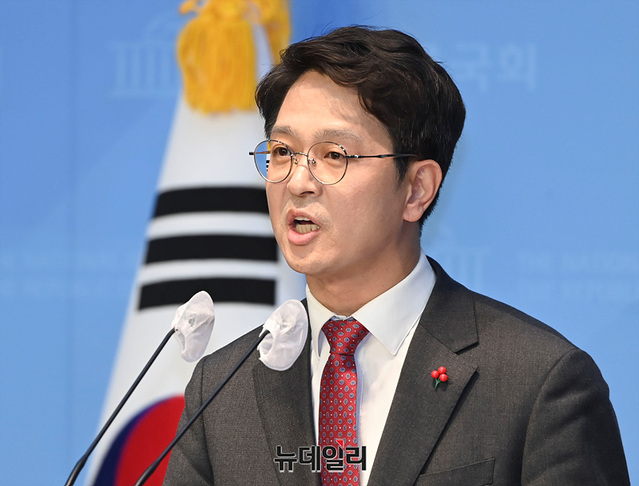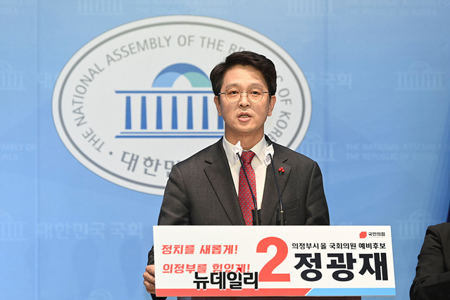 정광재 국민의힘 대변인이 8일 오후 국회 소통관에서 의정부을 출마선언 기자회견을 하고 있다.