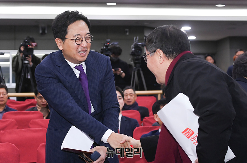 금태섭 새로운선택 공동대표가 9일 오전 국회 의원회관에서 열린 양향자 한국의희망 대표 출판기념회에서 인사를 나누고 있다.