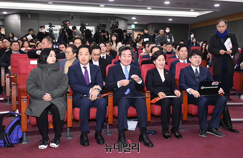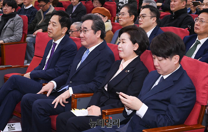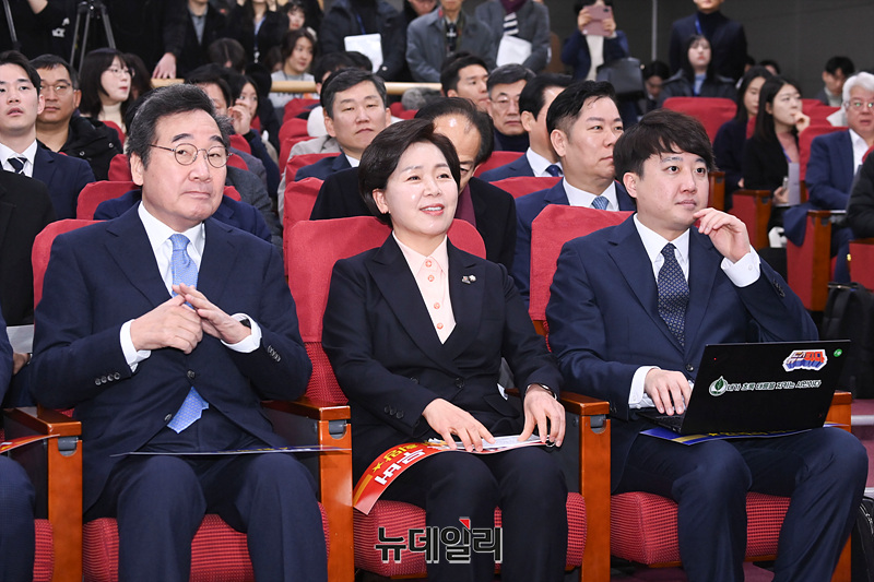 이낙연 전 더불어민주당 대표와 금태섭 새로운선택 공동대표, 이준석 전 국민의힘 대표가 9일 오전 국회 의원회관에서 열린 양향자 한국의희망 대표 출판기념회에 참석해 자리하고 있다.