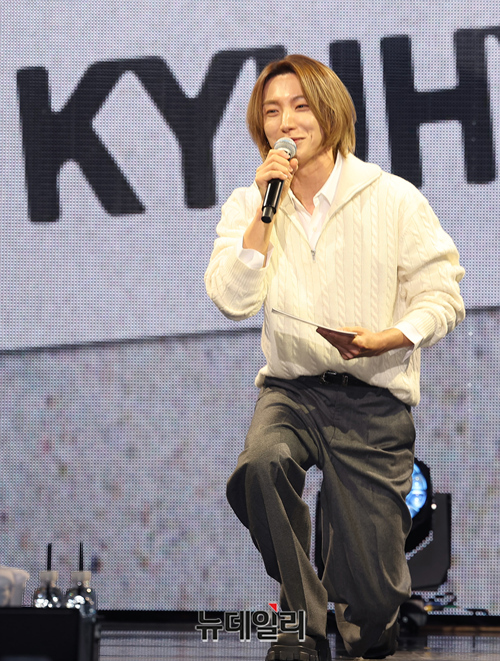 슈퍼주니어 리더 이특이 9일 오후 서울 용산구 블루스퀘어에서 열린 규현 솔로 EP 앨범 'Restart(리스타트)' 쇼케이스에서 큰절을 올리고 있다. 새로운 시작에 관한 이야기를 담은 이번 앨범은 타이틀곡 '그렇지 않아'를 비롯해 6트랙을 담았다.