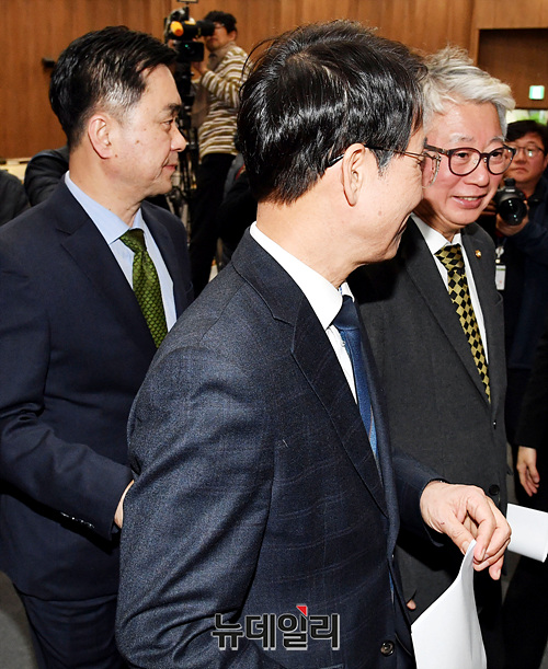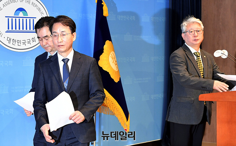 더불어민주당 비이재명계모임 '원칙과 상식' 김종민, 이원욱, 조응천 의원이 10일 국회 소통관에서 탈당 기자회견을 마치고 기자회견장을 나서고 있다.