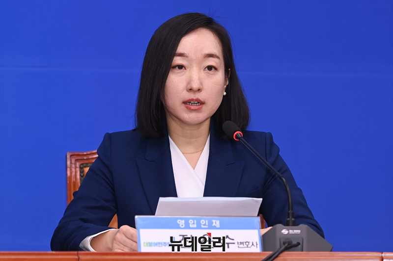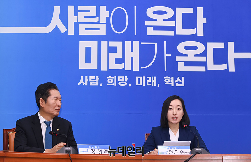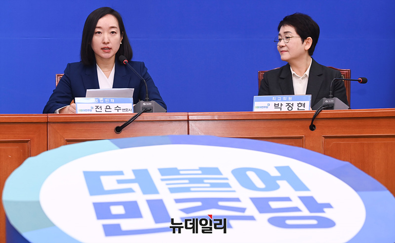 더불어민주당 7호 인재로 영입된 전은수 변호사가 10일 오전 국회에서 열린 인재영입식에서 인사말을 하고 있다.