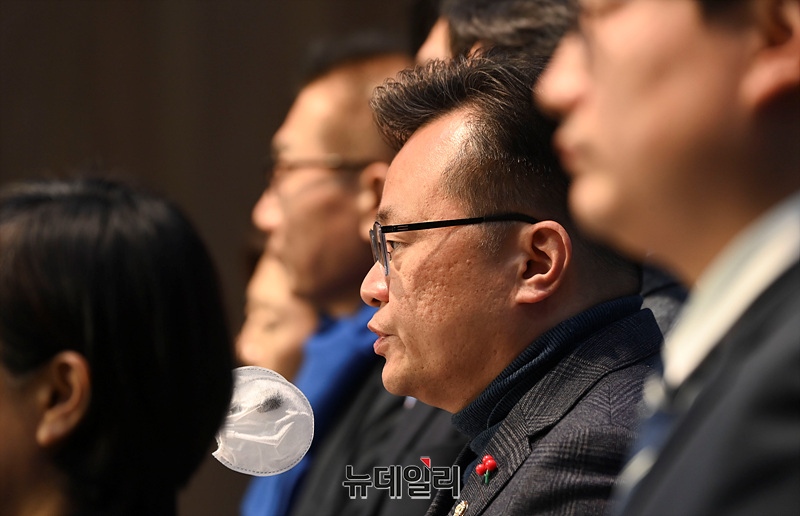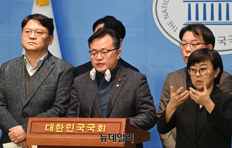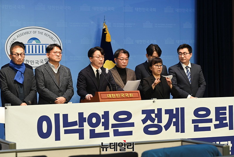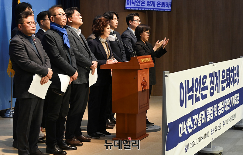 친이재명계 원외 모임 더민주전국혁신회의가 10일 국회에서 이낙연 전 더불어민주당 대표 탈당 규탄 기자회견을 하고 있다.