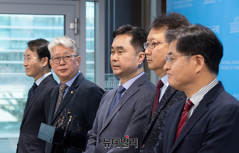 더불어민주당을 탈당한 이원욱, 김종민, 조응천 의원과 정태근, 박원석 전 의원이 12일 오전 국회 소통관에서 '미래대연합 창당 기자회견'을 마치고 취재진의 질문에 답하고 있다.