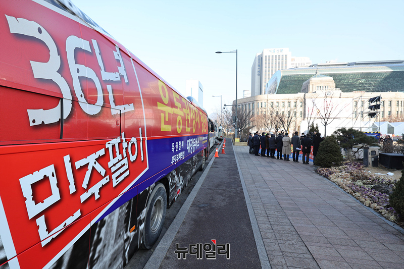 운동권 정치 청산과 정치개혁 시민행동 민심버스가 12일 오전 서울광장에서 열린 출정식에 참석하기 위해 도심에서 이동하고 있다.