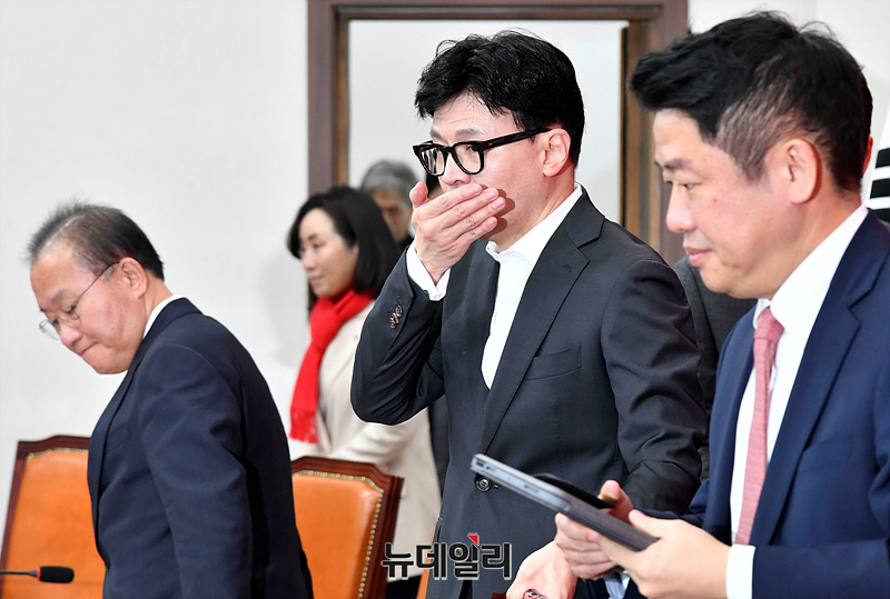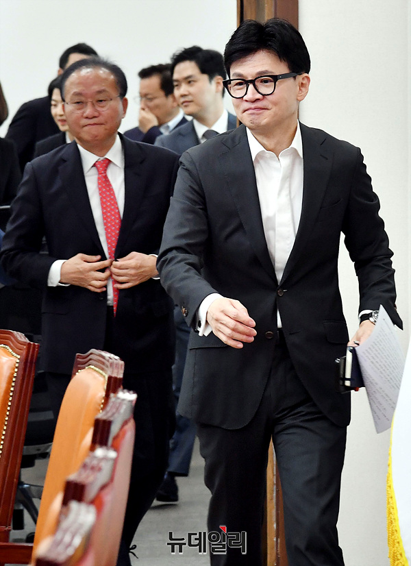 한동훈 국민의힘 비상대책위원장이 15일 오전 국회에서 열린 비상대책위원회의에 참석하고 있다.
