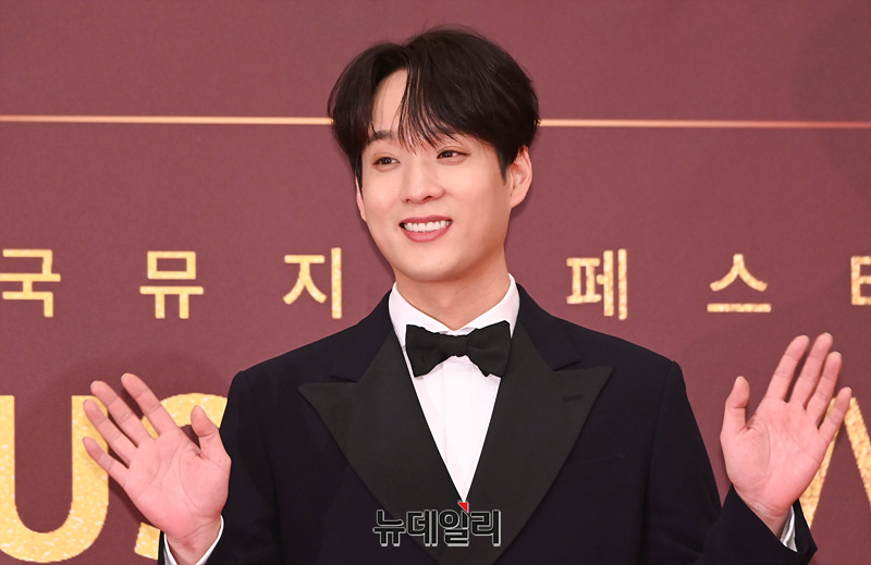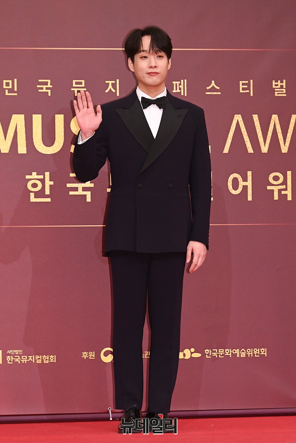 배우 김주택이 15일 오후 서울 동대문구 경희대학교 평화의전당에서 열린 '제8회 한국뮤지컬어워즈' 레드카펫에서 포즈를 취하고 있다.