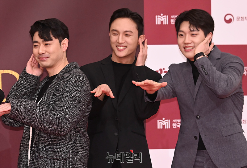 배우 김영은, 남궁민희, 권오경, 최비야, 박소현, 양성령, 최재훈, 정택수, 나인석이 15일 오후 서울 동대문구 경희대학교 평화의전당에서 열린 '제8회 한국뮤지컬어워즈' 레드카펫에서 포즈를 취하고 있다.한국뮤지컬어워즈는 매해 1월 한국 뮤지컬 시장의 한해를 총 결산하고 새롭게 한 해를 시작하는 의미로 뮤지컬인들을 격려하고 축하하는 시상식이다.사단법인 한국뮤지컬협회가 주최하고 문화체육관광부와 한국문화예술위원회가 후원하는 이번 시상식은 작품, 배우, 창작, 특별 총 4개 부문 21개상에 시상한다.