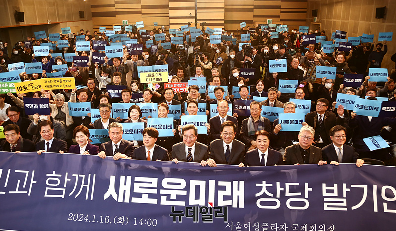 이낙연 전 더불어민주당 대표와 이준석 전 국민의힘 대표, 금태섭 새로운선택 공동대표, 양향자 한국의희망 대표를 포함한 참석자들이 16일 오후 서울 동작구 서울여성플라자에서 열린 새로운미래 창당발기인대회에서 기념촬영을 하고 있다.