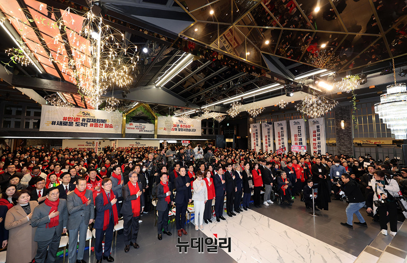 한동훈 국민의힘 비대위원장이 17일 오전 서울 마포구 케이터틀에서 열린 서울시당 신년인사회에 김선동 서울시당 위원장, 김민수 대변인과 함께 입장하고 있다.