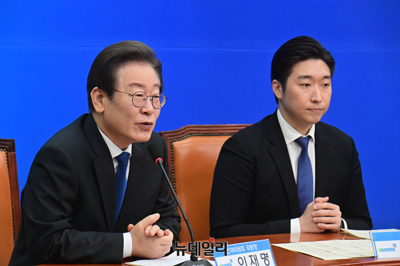 이재명 더불어민주당 대표가 17일 국회에서 열린 백범 김구 선생의 증손자 김용만 이사 인재환영식에서 모두발언을 하고 있다.