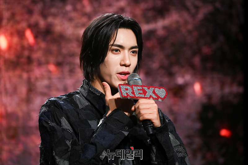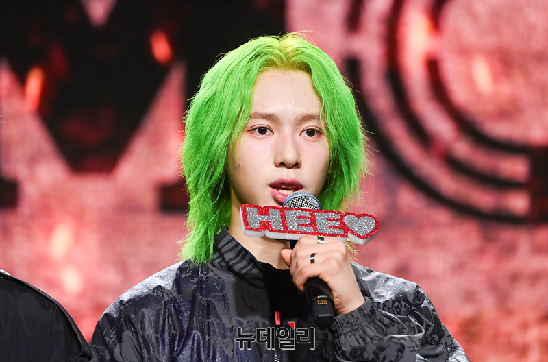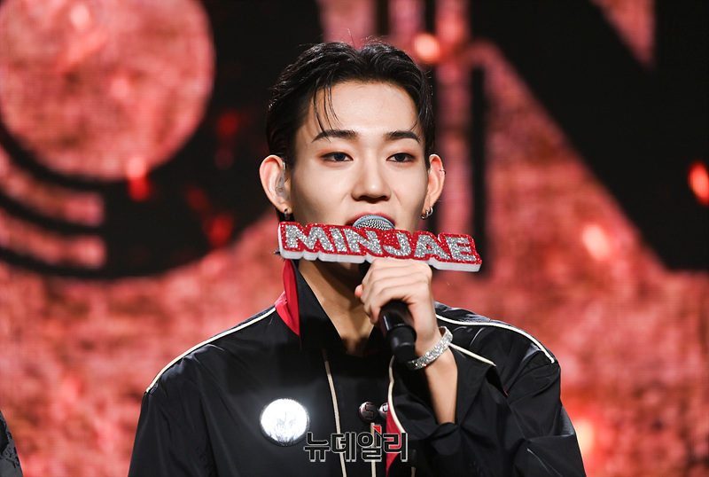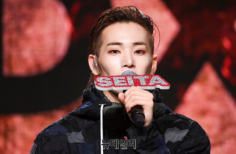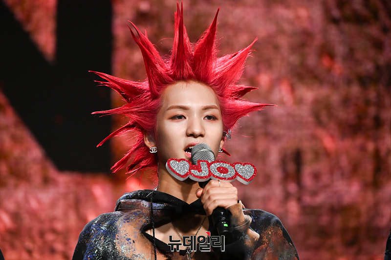 보이그룹 '다이몬(DXMON)' 세이타(왼쪽부터), 태극, 히, 민재, 조, 렉스가 17일 오후 서울 강남구 일지아트홀에서 열린 데뷔 쇼케이스에서 소감을 밝히고 있다.