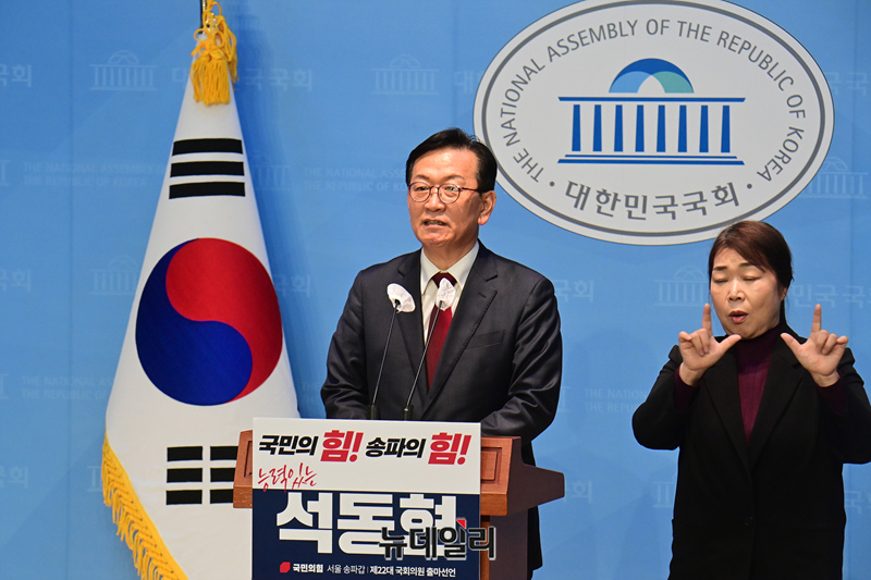 석동현 전 민주평화통일자문회의 사무처장이 18일 오후 국회 소통관에서 제22대 총선 송파갑 국회의원 출마선언 기자회견을 하고 있다.