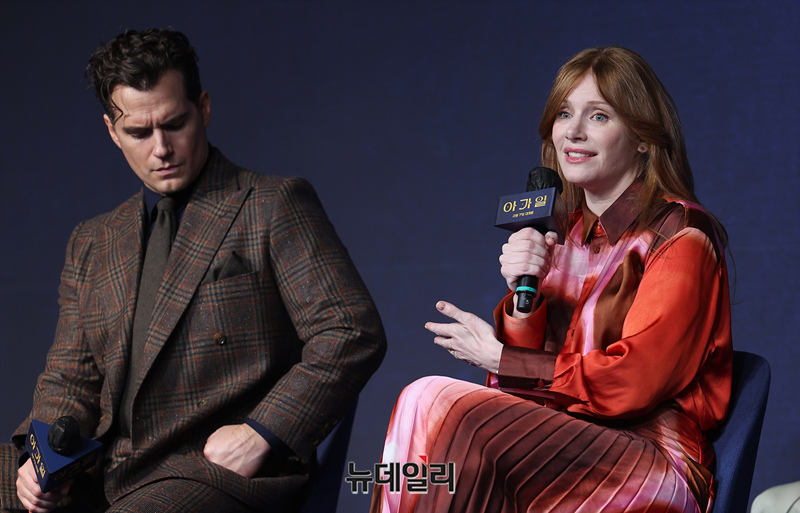 배우 헨리 카빌(왼쪽부터), 브라이스 달라스 하워드, 샘 록웰이 18일 오전 서울 종로구 포시즌스 호텔에서 열린 영화 '아가일' 내한 기자간담회에서 인사말을 하고 있다.'아가일' 은 자신의 스파이 소설이 현실이 되자 전 세계 스파이들의 표적이 된 작가 ‘엘리’가 위기를 벗어나기 위해 소설의 다음 챕터를 쓰고, 현실 속 레전드 요원 ‘아가일’을 찾아가는 액션 블록버스터다.배우들은 이날 오후 메가박스 코엑스에서 레드카펫에 올라 국내 팬들을 만날 예정이다. 영화는 2월 9일 극장 개봉.
