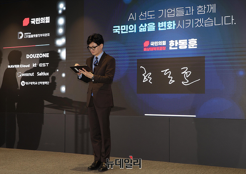 [포토] AI사업 지원 서약식, 전자서명하는 한동훈 비대위원장