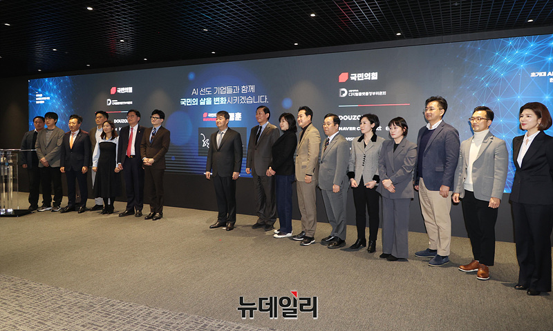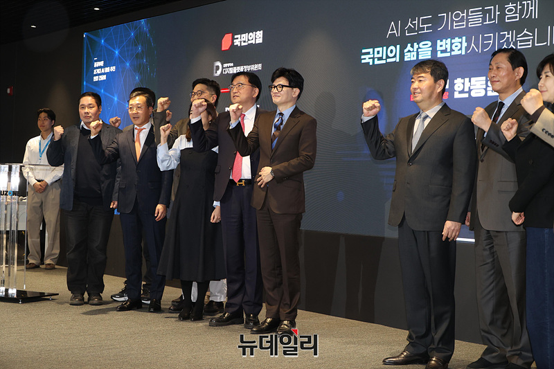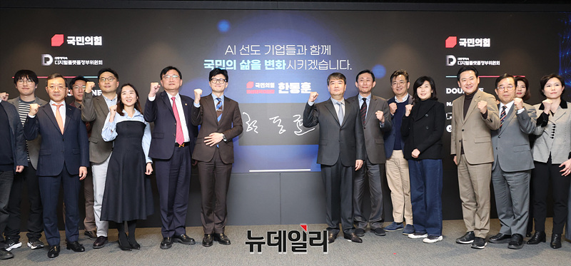 한동훈 국민의힘 비상대책위원장과 참석자들이 19일 오후 서울 중구 더존을지타워에서 열린 '함께하는 AI의 미래' 공공부문 초거대 AI활용 추진 현장간담회에서 한국 AI산업 지원 서약식을 마치고 기념촬영을 하고 있다.