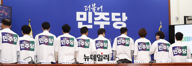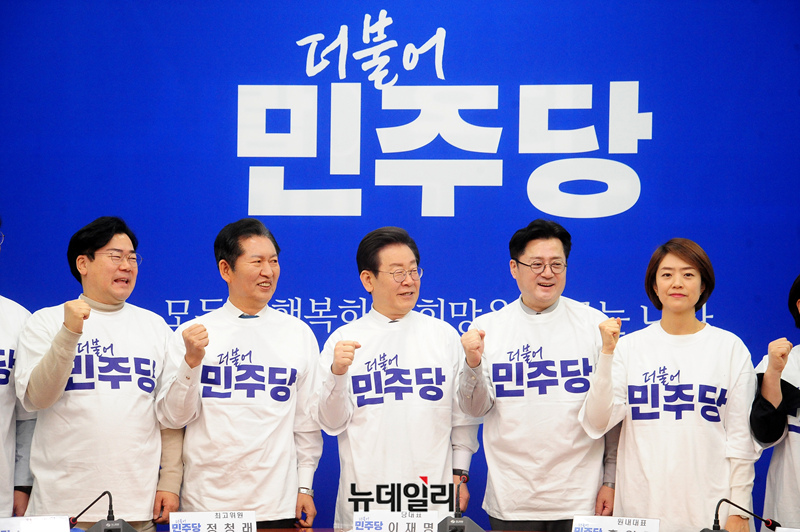이재명 더불어민주당 대표와 지도부가 24일 오전 국회에서 열린 새 PI 선포식에서 새 로고와 상징을 공개하고 있다.