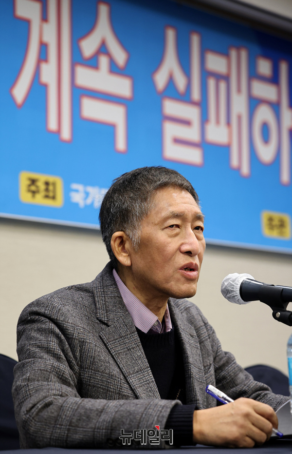 주동식 지역평등시민연대 대표가 26일 오후 서울 중구 한국프레스센터에서 열린 세미나에서 '우파의 정치학교는 왜 실패했는가?'를 주제로 발표하고 있다.