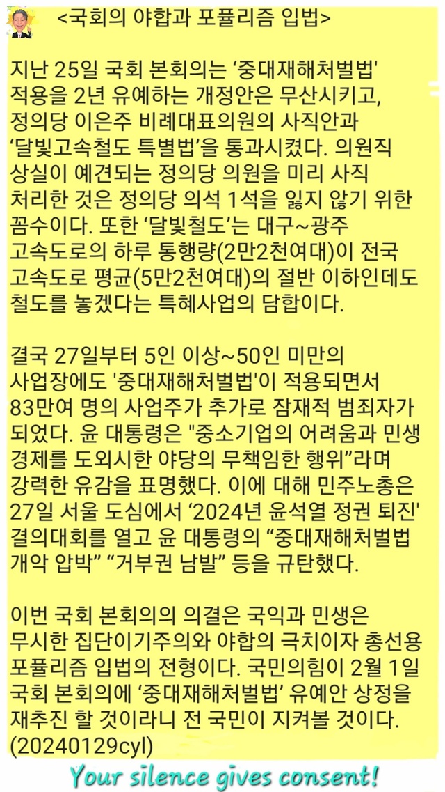 <국회의 야합과 포퓰리즘 입법>지난 25일 국회 본회의는 ‘중대재해처벌법' 적용을 2년 유예하는 개정안은 무산시키고, 정의당 이은주 비례대표의원의 사직안과 ‘달빛고속철도 특별법’ 을 통과시켰다.