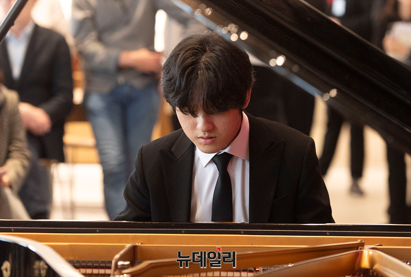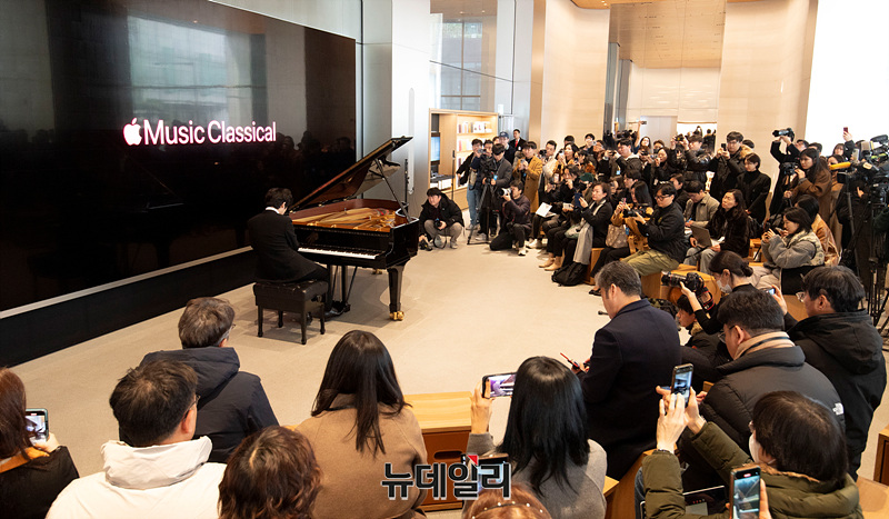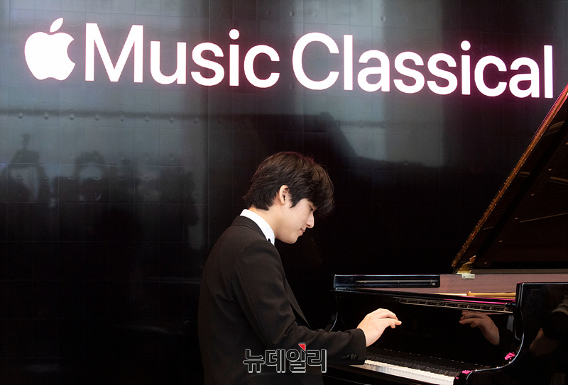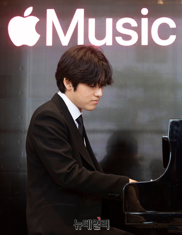 피아니스트 임윤찬이 29일 오후 서울 중구 애플스토어 명동에서 열린 '애플 뮤직 클래시컬 출시 기자간담회'에서 피아노 연주를 하고 있다.