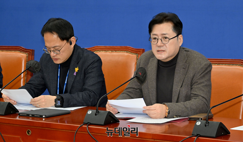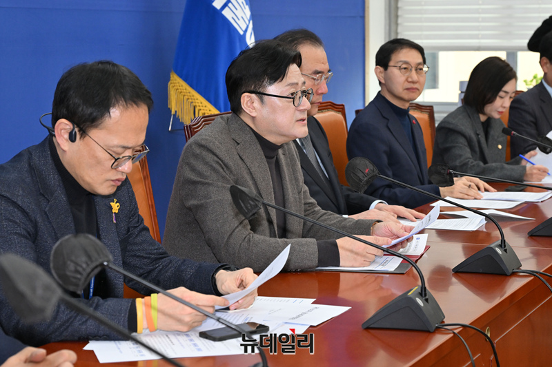 홍익표 더불어민주당 원내대표가 30일 오전 국회에서 열린 원내대책회의에서 모두발언을 하고 있다.
