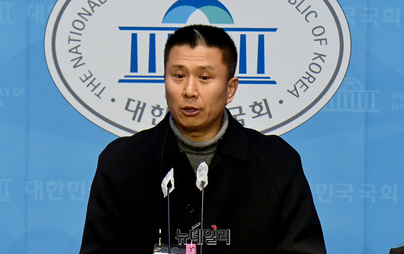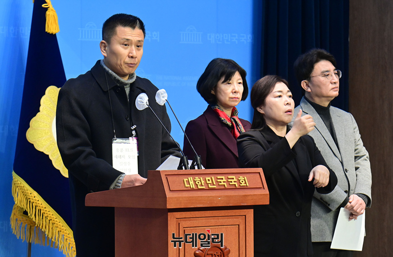 길성주 홍콩 ELS 피해자 모임 위원장이 30일 오전 국회 소통관에서 열린 홍콩 지수 기반 ELS 피해 사태 피해자 기자회견에서 억울함을 호소하고 있다.