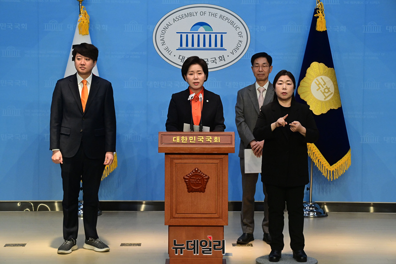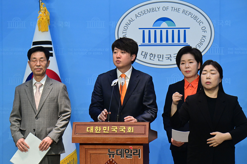 이준석 개혁신당 대표와 양향자 한국의희망 대표가 30일 국회 소통관에서 한국의희망 1호 영입인재 이창한 전 반도체협회 부회의장의 입당 발표 기자회견을 하고 있다.