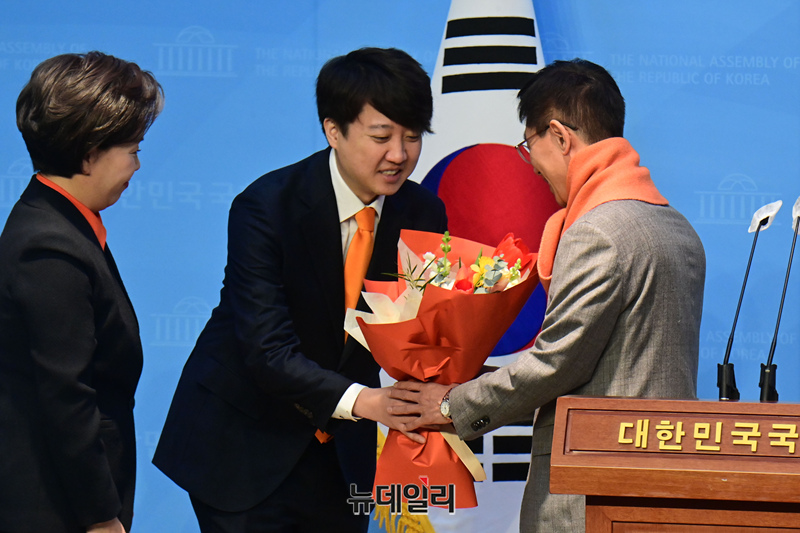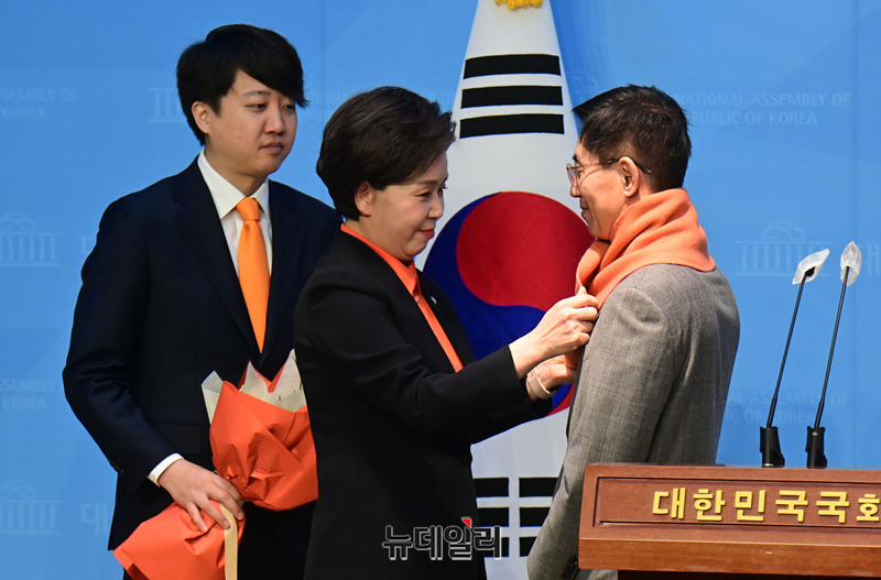 이준석 개혁신당 대표와 양향자 한국의희망 대표가 30일 국회 소통관에서 한국의희망 1호 영입인재 이창한 전 반도체협회 부회의장의 입당 발표 기자회견을 미치고 기념촬영을 하고 있다.