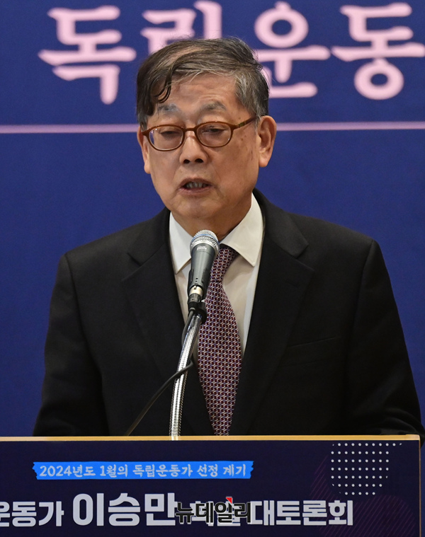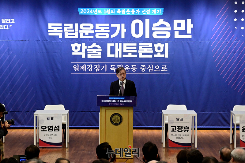광복회, 국가보훈부, 독립기념관, 윤주경 국회의원이 공동 주최 '독립운동가 이승만 학술 대토론회'가 30일 오후 국회 도서관 대강당에서 열린 가운데 김황식 이승만대통령기념재단 이사장이 축사를 하고 있다.이날 학술토론회에는 이태진 서울대학교 국사학과 명예교수의 사회로 오영섭 국학문화연구원 원장이 '이승만의 외교독립운동의 성격과 성과'를, 고정휴 포스텍 인문사회학부 명예교수가 '이승만, 그의 독립운동을 어떻게 볼 것인가?'를 주제로 발표에 나섰다.