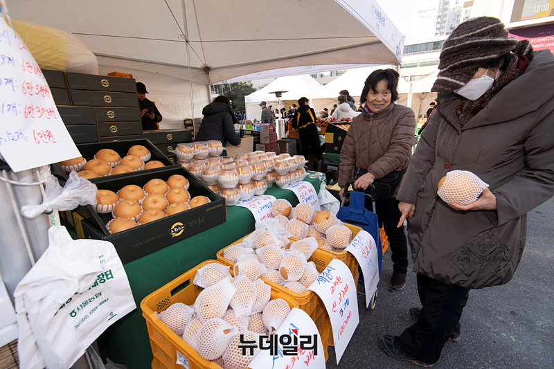 '강남구 설맞이 직거래장터'에 참가한 80여개 농가가 31일 오전 서울 강남구청 주차장에서 열린 장터에서 지역 특산물을 판매하고 있다.