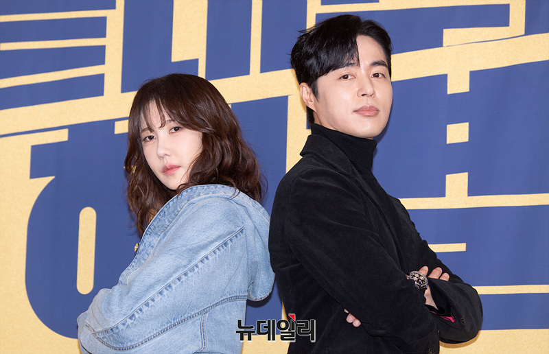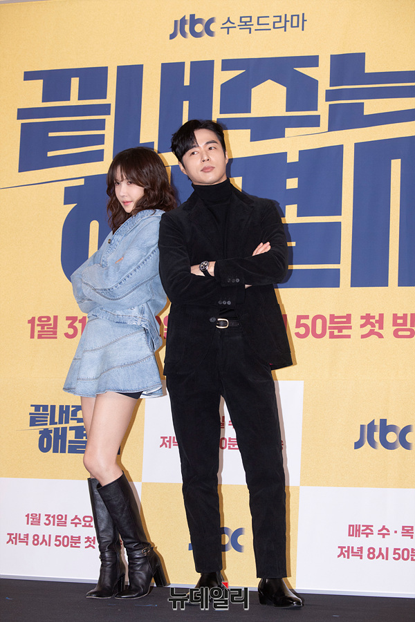 배우 이지아와 오민석이 31일 오후 서울 마포구 상암 스탠포드 호텔에서 열린 JTBC 수목드라마 '끝내주는 해결사(연출 박진석)' 제작발표회에서 포즈를 취하고 있다.