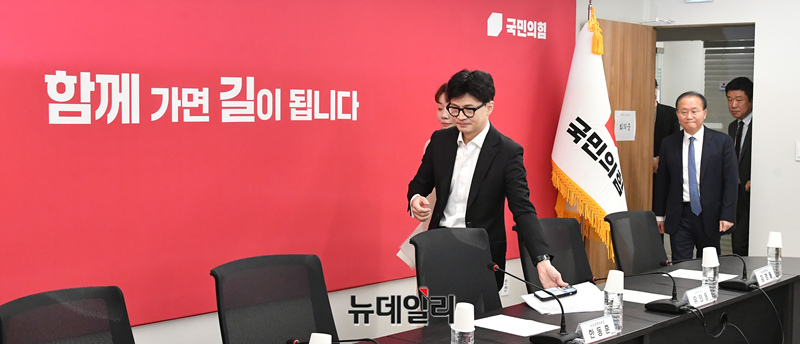 한동훈 국민의힘 비상대책위원장이 1일 오전 서울 여의도 중앙당사에서 열린 비상대책위원회의에서 김예지 비상대책위원을 에스코트 하고 있다.
