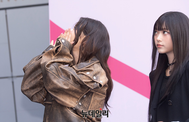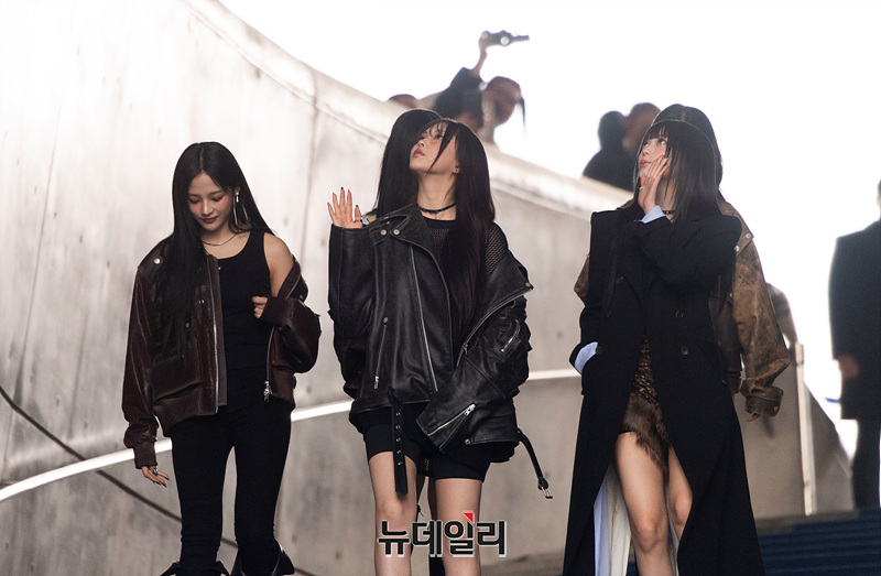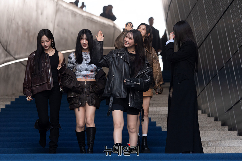 걸그룹 뉴진스가 1일 오전 서울 중구 동대문디자인플라자에서 열린 '2024 F/W 서울패션위크' 포토월에 참석하며 팬들에게 인사하고 있다.