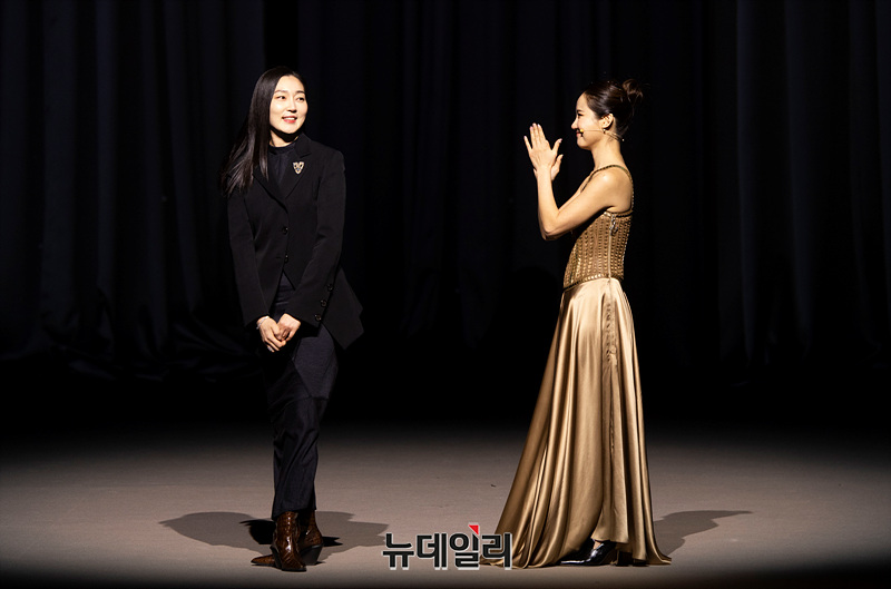 박소영 디자이너와 박혜상 소프라노가 1일 오후 서울 중구 동대문디자인플라자에서 열린 패션브랜드 '줄라이칼럼(JULYCOLUMN)' 런웨이에서 인사를 나누고 있다.