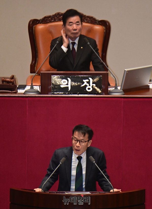 비례의원직을 승계한 양경규 녹색정의당 의원이 1일 국회에서 열린 본회의에서 인사말을 하고 있다.