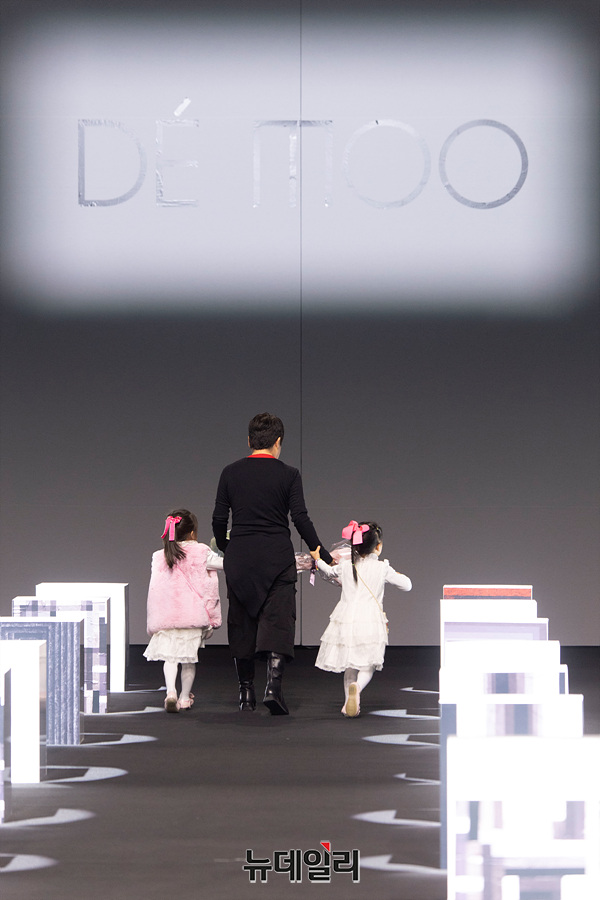 디자이너 박춘무가 1일 오후 서울 중구 동대문디자인플라자에서 열린 '2024 F/W 서울패션위크'에서 진행된 '데무 박춘무(DEMOO PARKCHOONMOO)' 런웨이에서 꽃다발을 받고 있다.