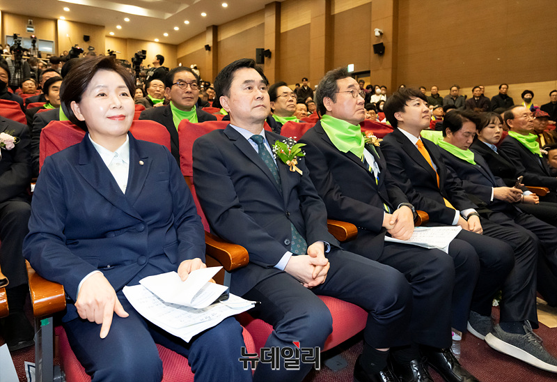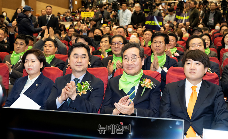 양향자 개혁신당 원내대표(왼쪽부터), 김종민 새로운미래 공동대표, 이낙연 공동대표, 이준석 개혁신당 대표가 4일 오후 국회에서 열린 새로운미래 중앙당 창당대회에 참석해 자리하고 있다.