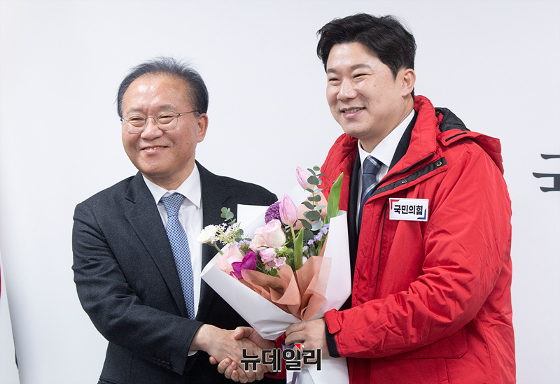 윤재옥 국민의힘 원내대표가 5일 오전 서울 여의도 중앙당사에서 열린 인재영입식에서 진종오 대한체육회 이사에게 꽃다발을 전달하고 있다.