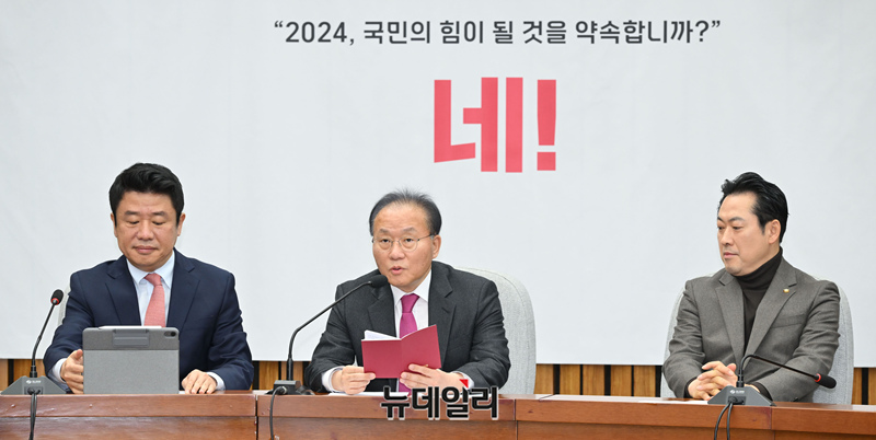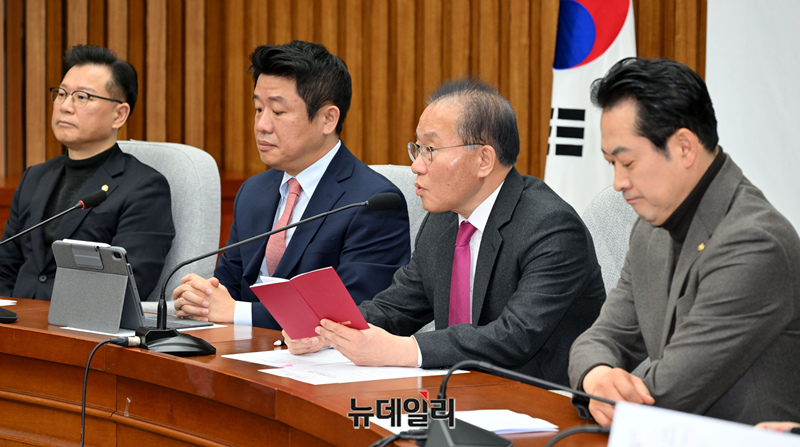 윤재옥 국민의힘 원내대표가 6일 오전 국회에서 열린 원내대책회의에서 모발언을 하고 있다.