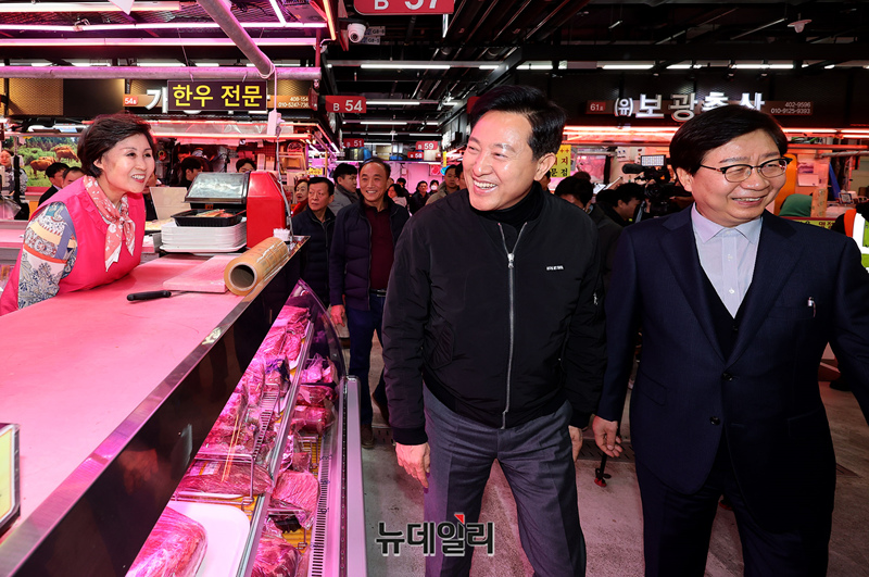 오세훈 서울시장, 문영표 서울시농수산식품공사 사장이 설 연휴를 앞둔 6일 오후 서울 송파구 가락시장을 방문해 민생물가 현장점검을 하고 있다.