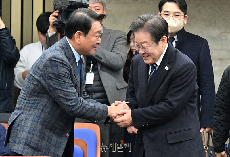 [포토] 의원들과 악수 나누는 이재명 더불어민주당 대표