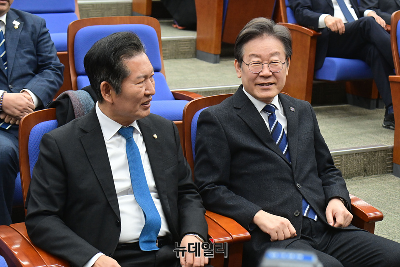 이재명 더불어민주당 대표와 정청래 최고위원이 6일 국회에서 열린 의원총회에 참석해 대화를 나누고 있다.