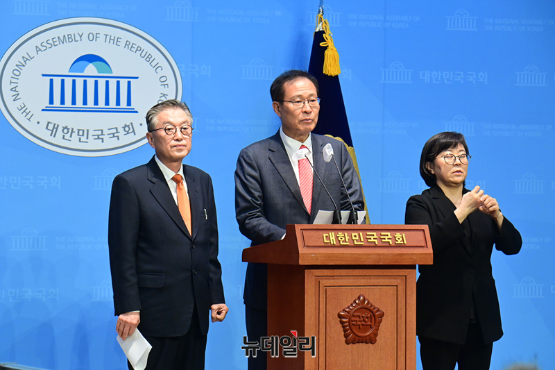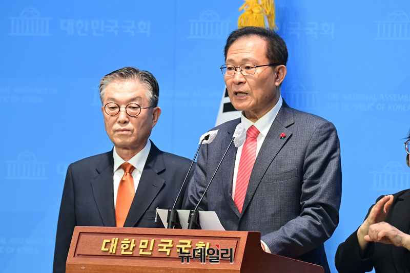 개혁신당 문병호·안영근 전 국회의원이 7일 국회에서 22대 총선 출마 기자회견을 하고 있다.