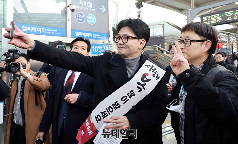 한동훈 국민의힘 비상대책위원장이 설 연휴를 하루 앞둔 8일 오전 서울 중구 서울역에서 귀성인사를 하며 시민들과 사진을 찍고 있다.