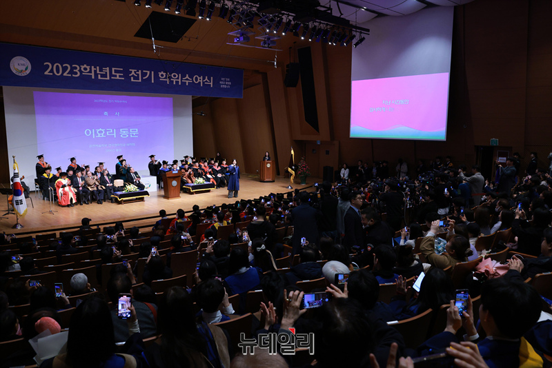 가수 이효리(연극영화전공 98학번)가 14일 오전 서울 성북구 국민대학교 콘서트홀에서 열린 '2023학년도 전기 학위수여식'에서 축하공연을 하고 있다.