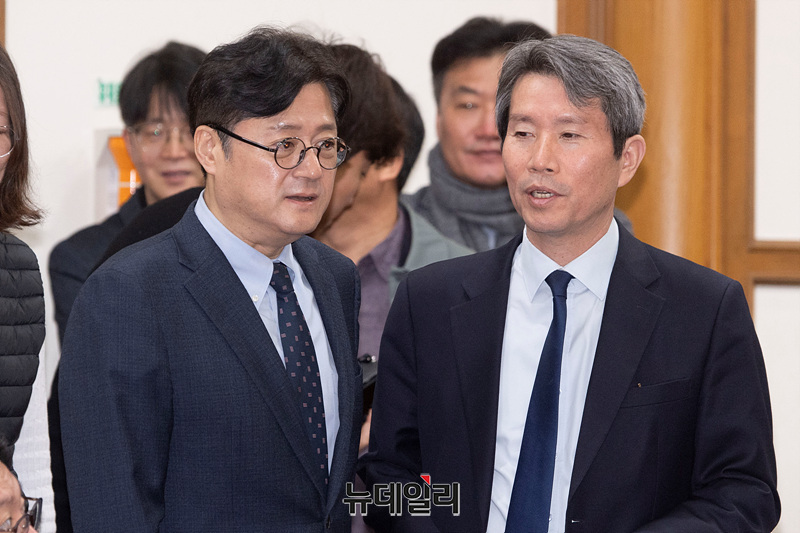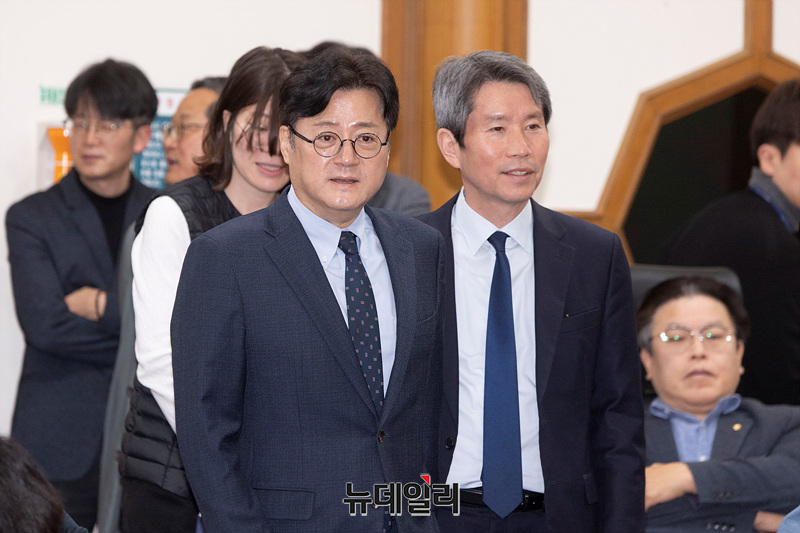 홍익표 더불어민주당 원내대표와 이인영 의원이 14일 오전 국회 의원회관에서 열린 제8회 민주주의자 김근태상 시상식에 참석하고 있다.