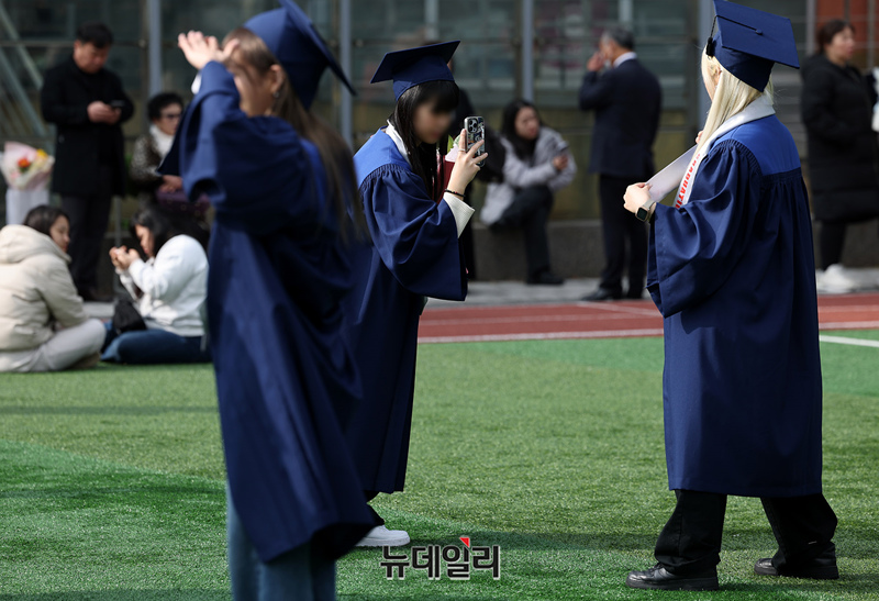 국민대 졸업생과 가족들이 14일 오전 서울 성북구 국민대학교에서 열린 '2023학년도 전기 학위수여식'에서 기념촬영을 하고 있다.